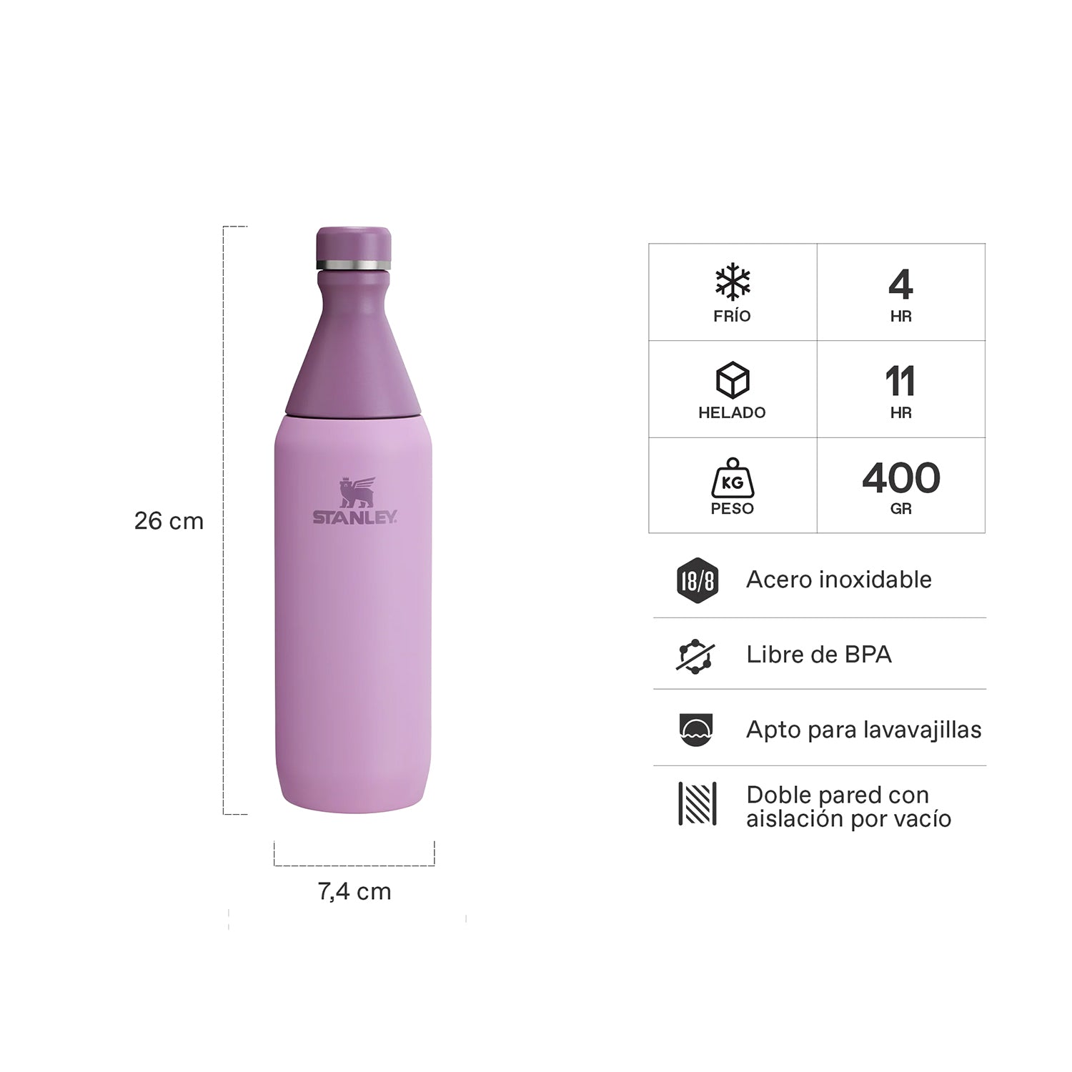 Con una forma icónica, el diseño delgado hace que sea fácil de transportar. Esta botella de agua tiene dos aperturas, la mas grande para poner hielo en la botella y la segunda para tomar directamente. La botella All Day Slim de 20 onzas es sustentable, aunque un poco inesperada. Solo dale unas vueltas al cuello para cerrarla y lograr un sello a prueba de fugas y destapa cada vez que necesites beber. La construcción de acero inoxidable proporciona sorbos helados durante horas. ¡Incluso puede contener una botella entera de vino! Ya sea que viva junto a tu bolso de playa o se convierta en tu favorito durante el vuelo, mantén la hidratación simple.