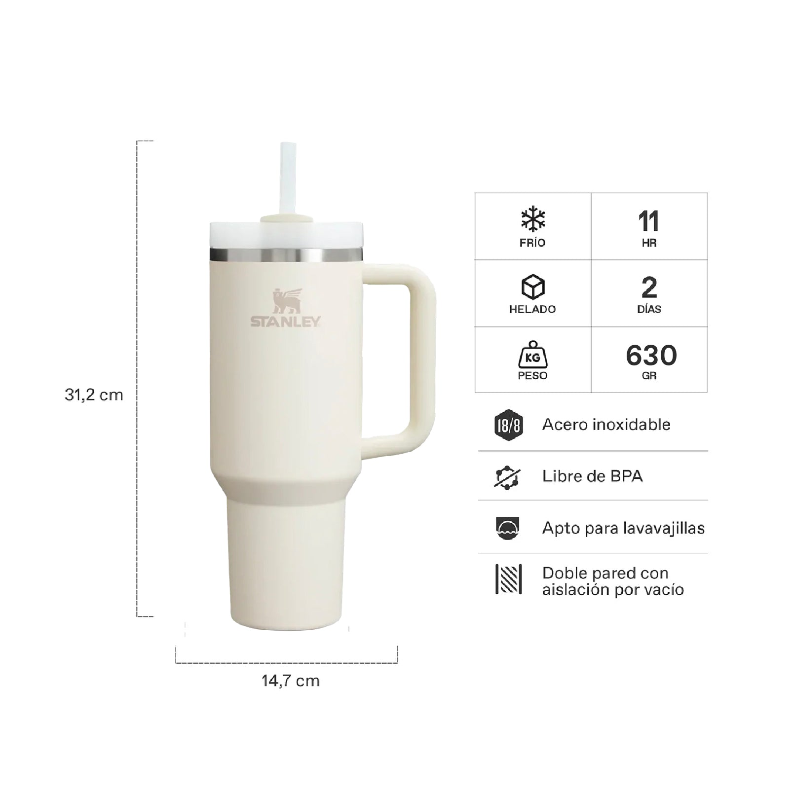 Mantiene 11 horas líquidos fríos y hasta 2 días congelado. No se recomienda para líquidos calientes.