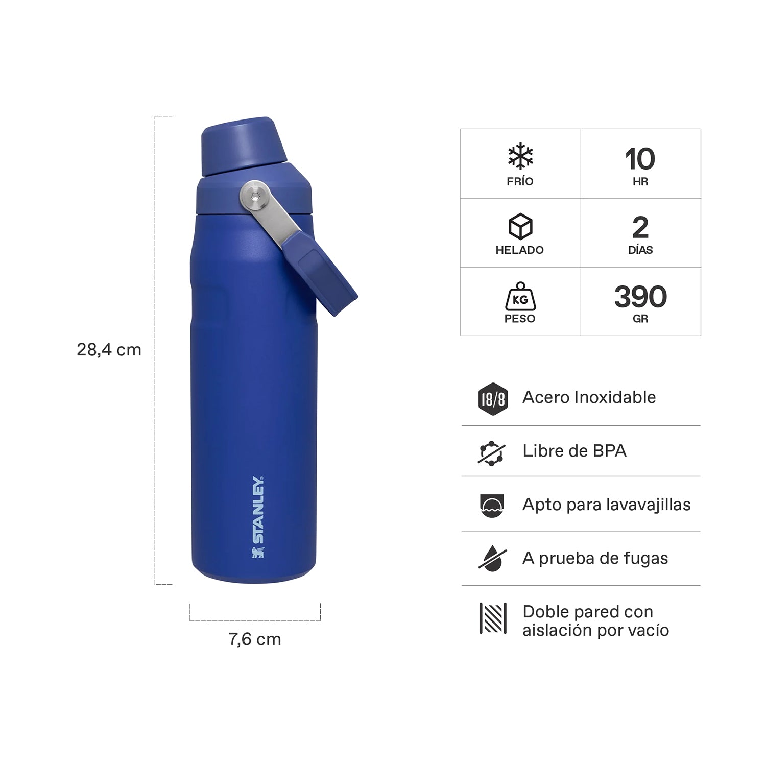 La tapa de esta botella de agua con boquilla en ángulo y a prueba de fugas está diseñada para servir, beber y limpiar de forma rápida y fácil. Puedes poner la tapa en el soporte integrado del mango para guardarla mientras bebes. Esta botella de agua tiene una asa para transportarla facilmente, la tecnología de peso pluma AeroLight y nuestro aislamiento al vacío de doble pared para mantener el agua fría durante 10 horas y 2 días con hielo.