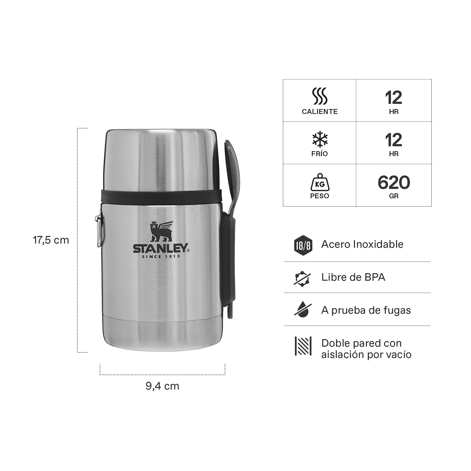 Este práctico termo de comida es el compañero ideal para tus aventuras. Tiene un compartimiento adicional en la tapa, perfecta para llevar fósforos, sal, pimienta, frutos secos u otros. Mantiene tu comida caliente o fría durante 12 horas.