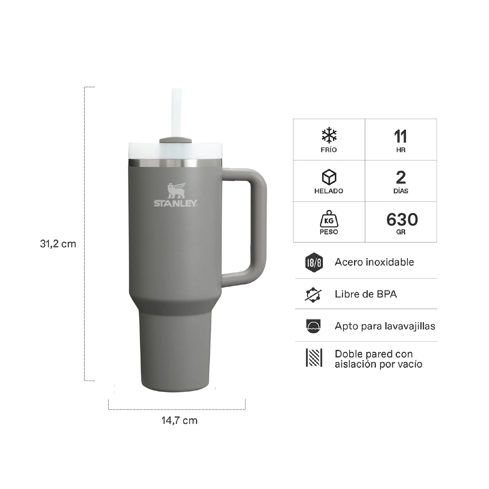 Mantiene 11 horas líquidos fríos y hasta 2 días congelado. No se recomienda para líquidos calientes.